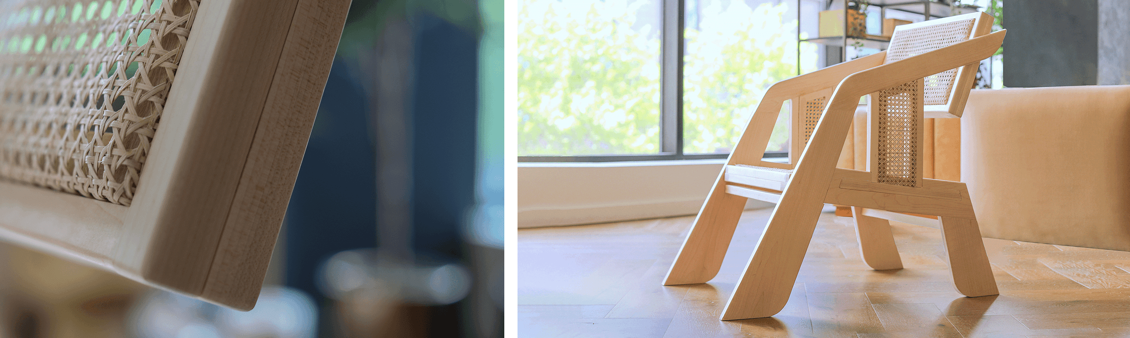 Considerations balanced material durability, ease of production, and cost efficiency. I developed an unconventional adhesion method for the cane webbing — using an inner and outer frame to create an upholstery-like appearance.