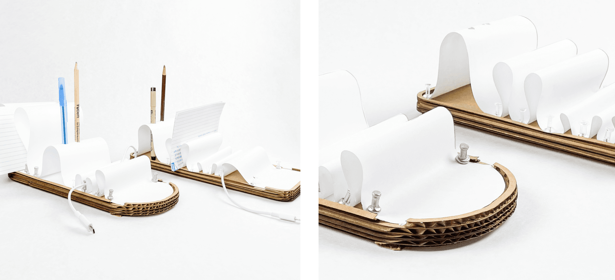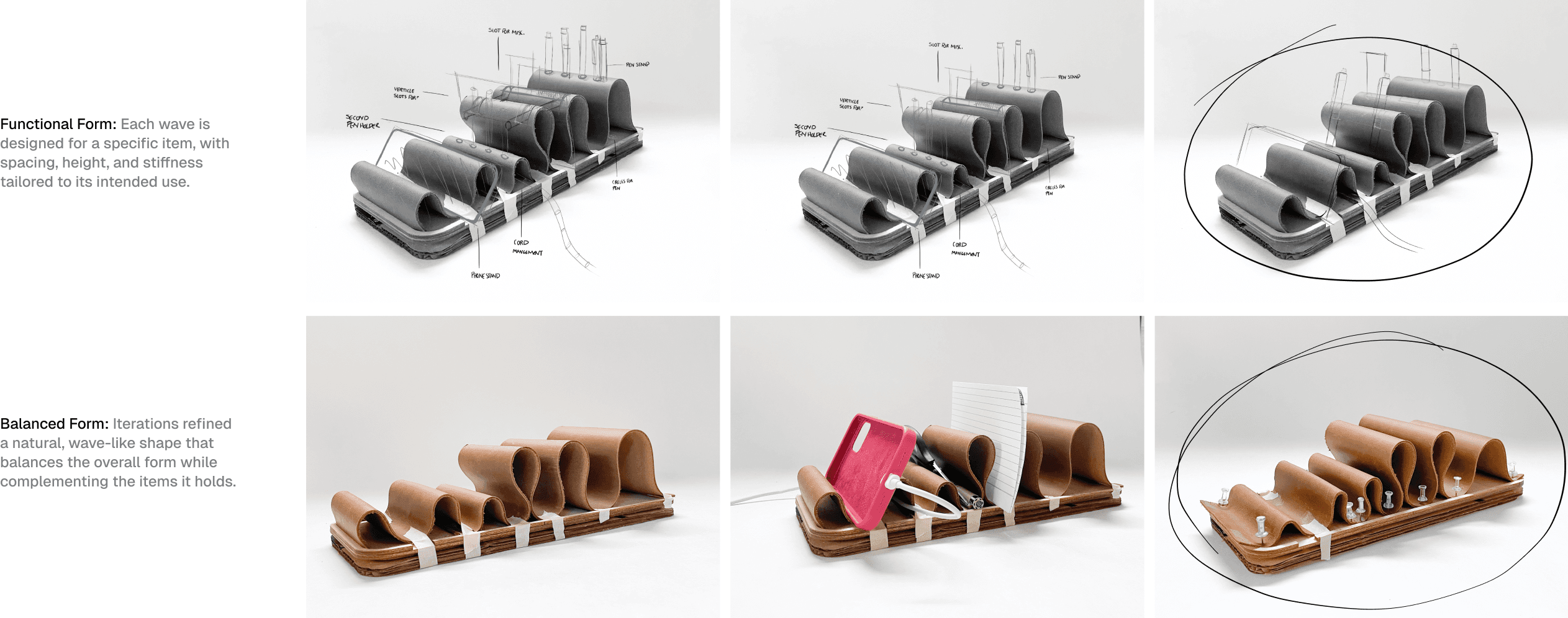 My initial idea was inspired by a flowing, organic form—something that naturally suggested pockets and curves that could hold small items like pens, note cards, and other desk accessories.